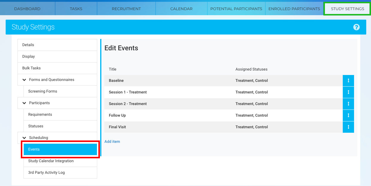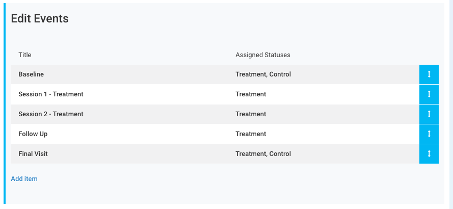 In this study, all participants are required to complete a Baseline Appointment and a Final Visit. However, only participants in the Treatment Group are assigned treatment sessions. This ensures that each participant only sees Events relevant to their assigned group, improving study organization and workflow efficiency.