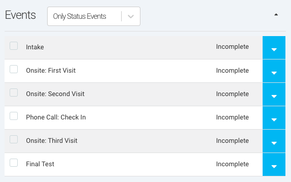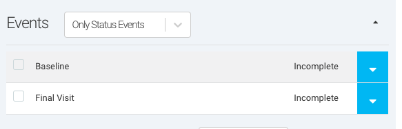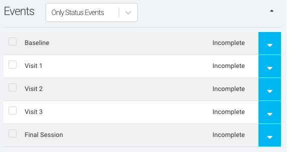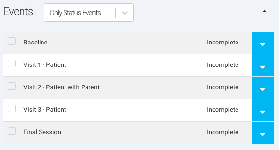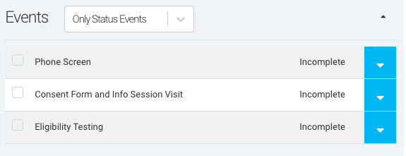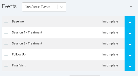 Ripple allows users to assign specific Events to participant Statuses, ensuring that only relevant Events appear on a participant’s profile as they progress through a study. This feature enhances workflow efficiency by displaying only the necessary Events for each participant’s Status, facilitating protocol branching and study-specific needs.