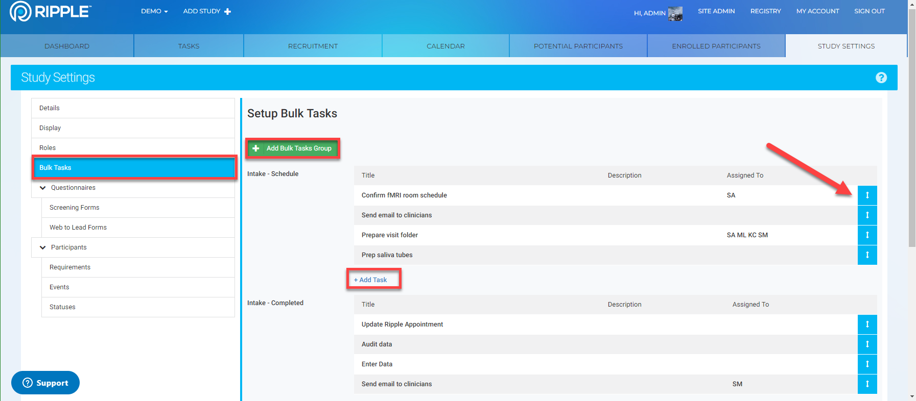 - Navigate to Study Settings--->Bulk Tasks Tab.