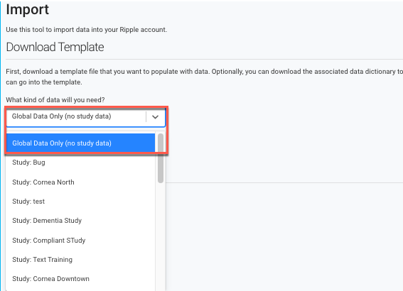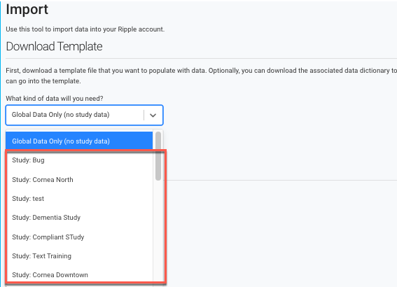 Ripple allows users to upload two types of data: Global Data and Study-Specific Data. Understanding the difference ensures accurate data management across studies.