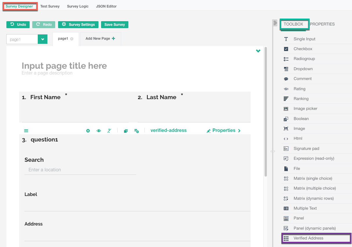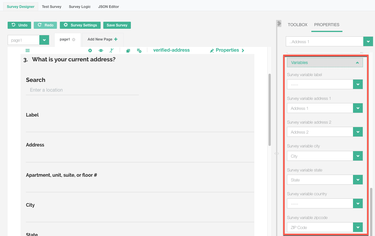 - Drag and Drop the Verified Address field into the survey designer.