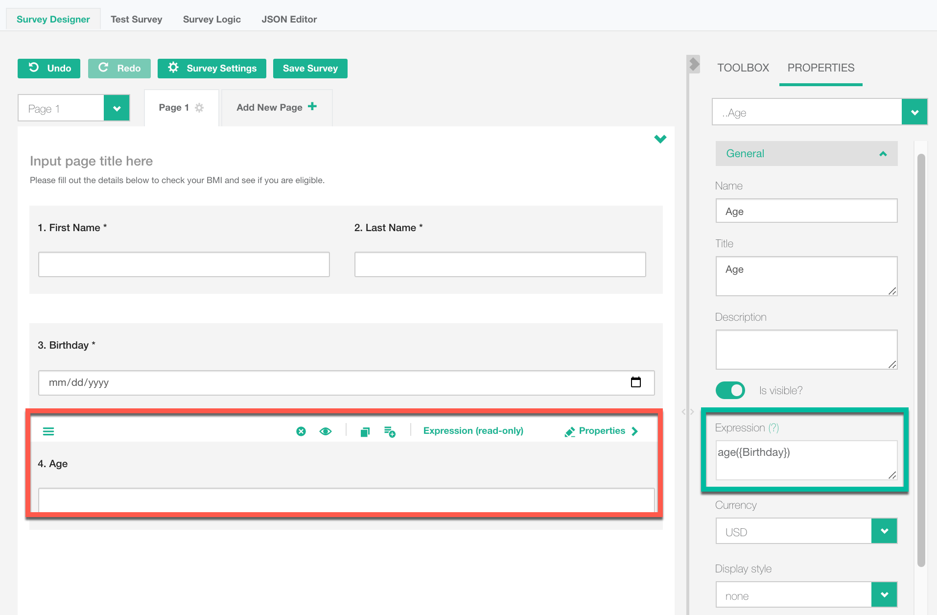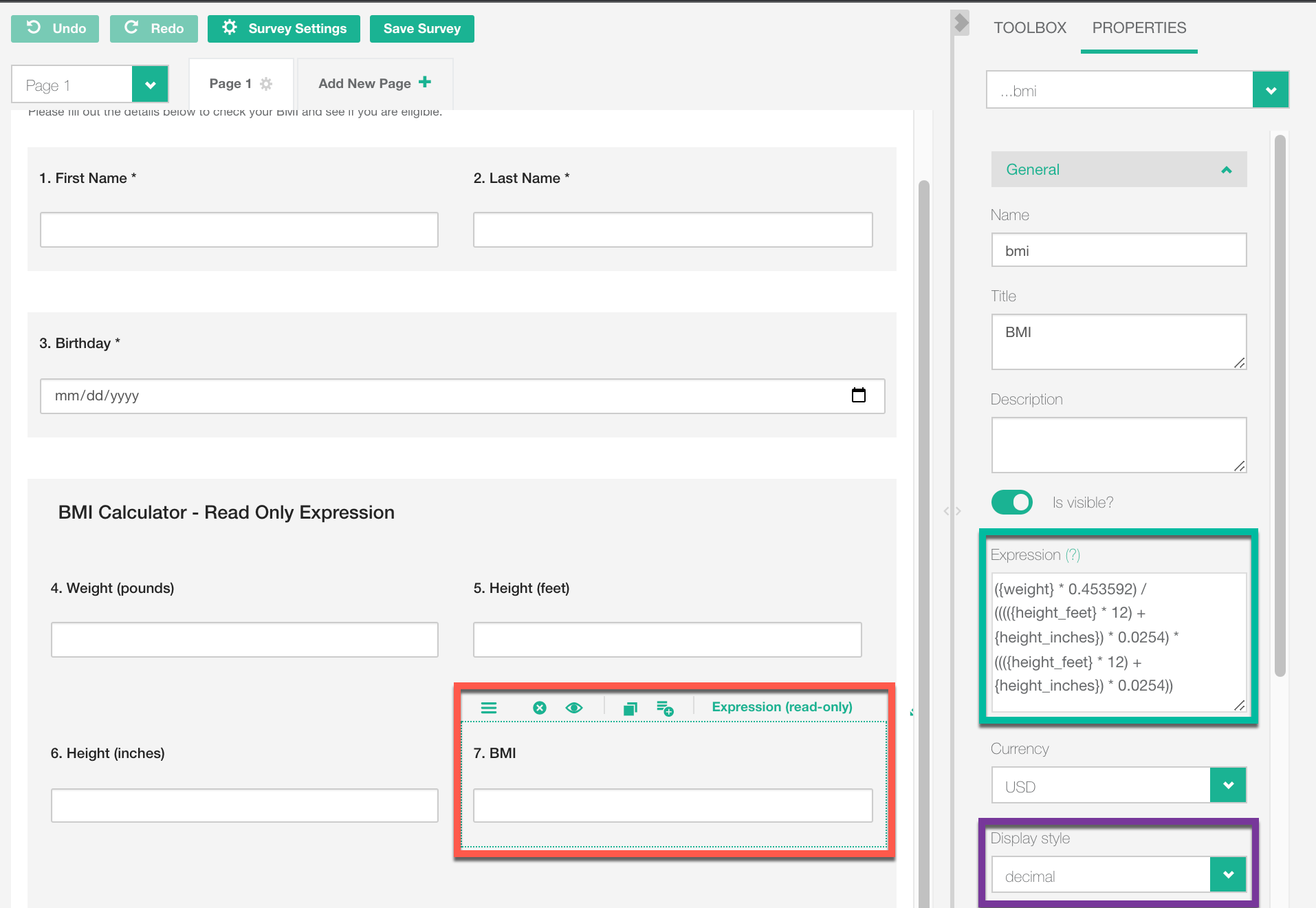 - Create an "Expression (Read-Only)" question named "BMI".