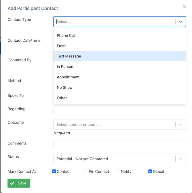 Once saved, the new contact type becomes available for all participants within that study.