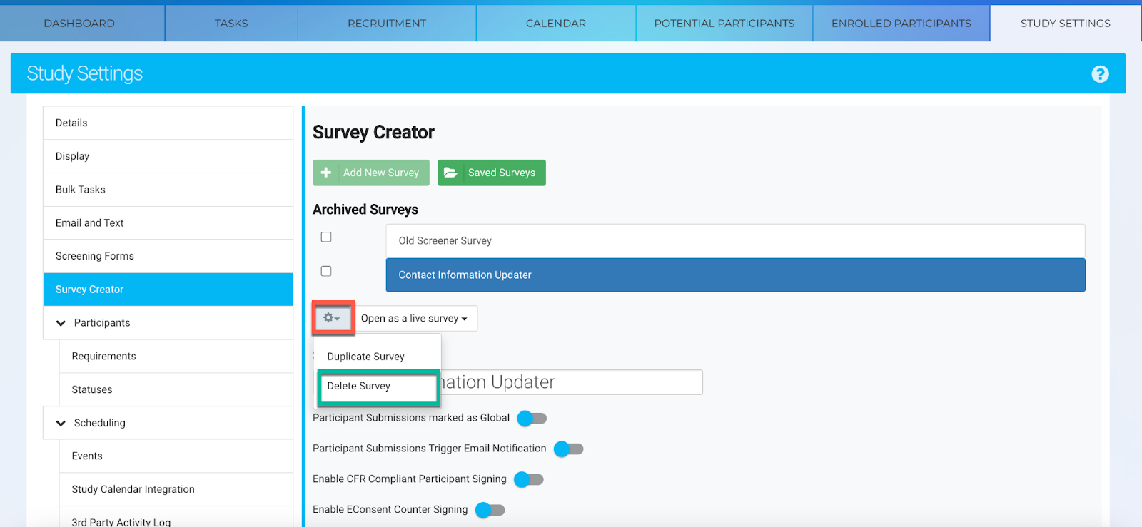 - Purpose: Study Admins can delete surveys to prevent future use, ensuring outdated or irrelevant surveys aren’t accessible to staff or participants.