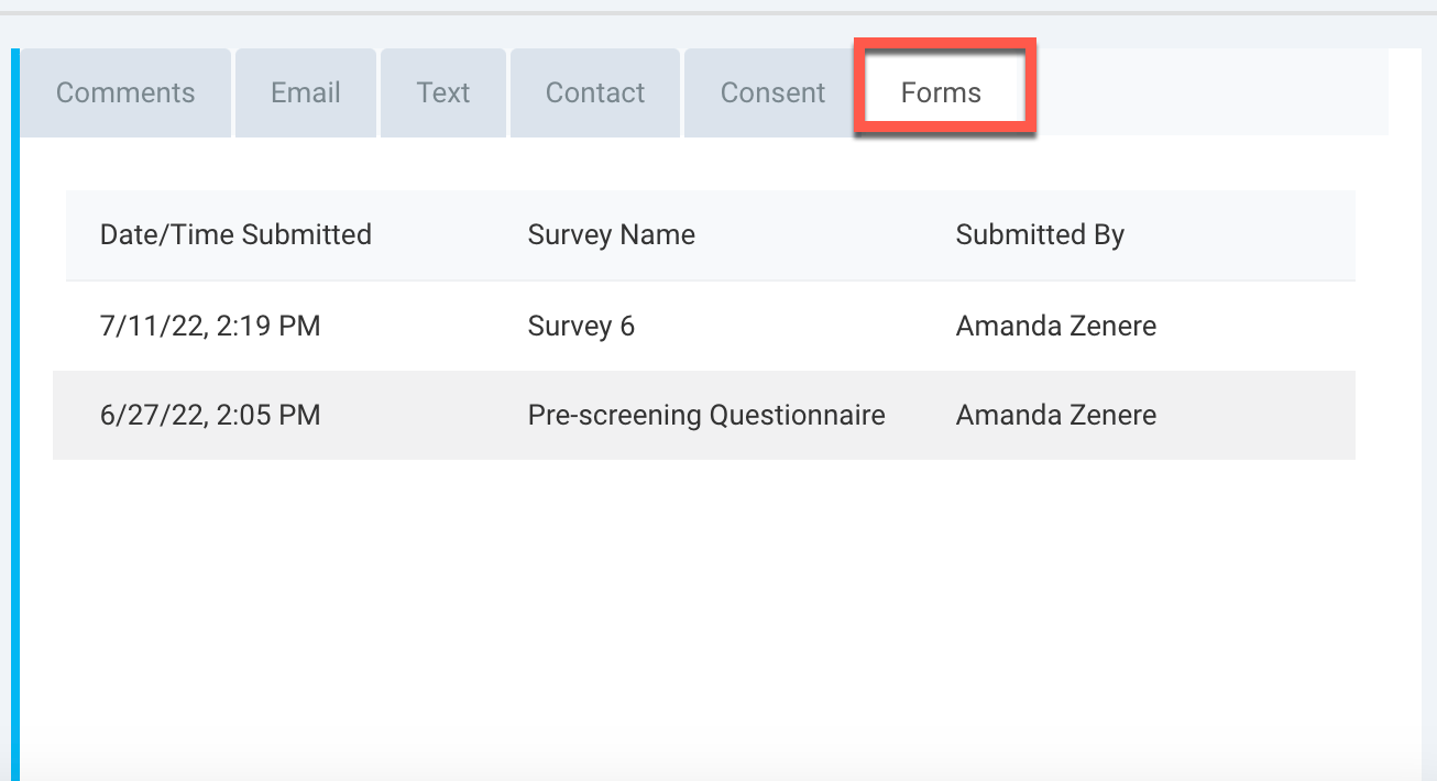 - Completed surveys remain viewable and downloadable from participants' profile cards (Forms Log).