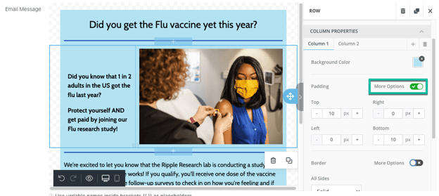 - Toggle the “More Options”(green) button to individually adjust padding for the top, right, left, and bottom of the column.