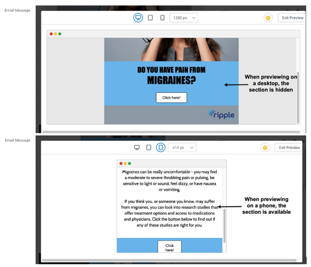 - When hidden, the block appears faded in the editor but will not be visible to recipients on the selected device.