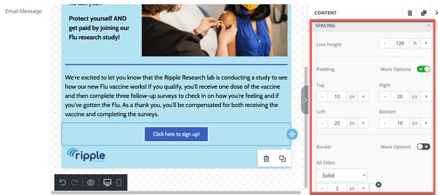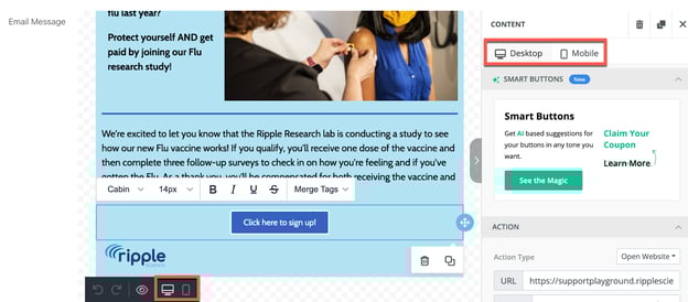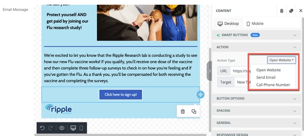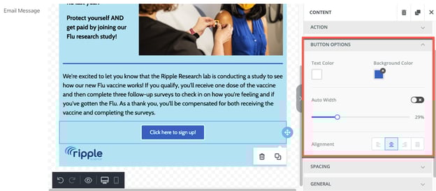 The Button element in Ripple’s email templates allows you to create clickable buttons that perform specific actions—such as directing participants to a website, survey, email, or phone call. This feature is ideal for driving participant engagement and simplifying calls to action (CTAs) within your email communications.