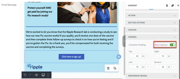 Use the More Options toggle to fine-tune padding for each side of the button’s placement area.
