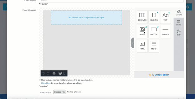 - Click on the IMAGE icon, hold it, and drag it into the email body.