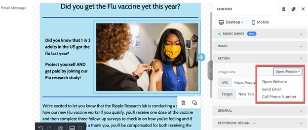 Actions: Assign actions like opening a survey, sending an email, or initiating a phone call when the image is clicked.