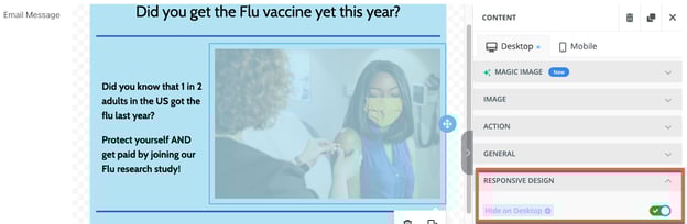 - When toggled on, the image will appear faded in the email editor, indicating it will be hidden for participants viewing the email on the specified device.