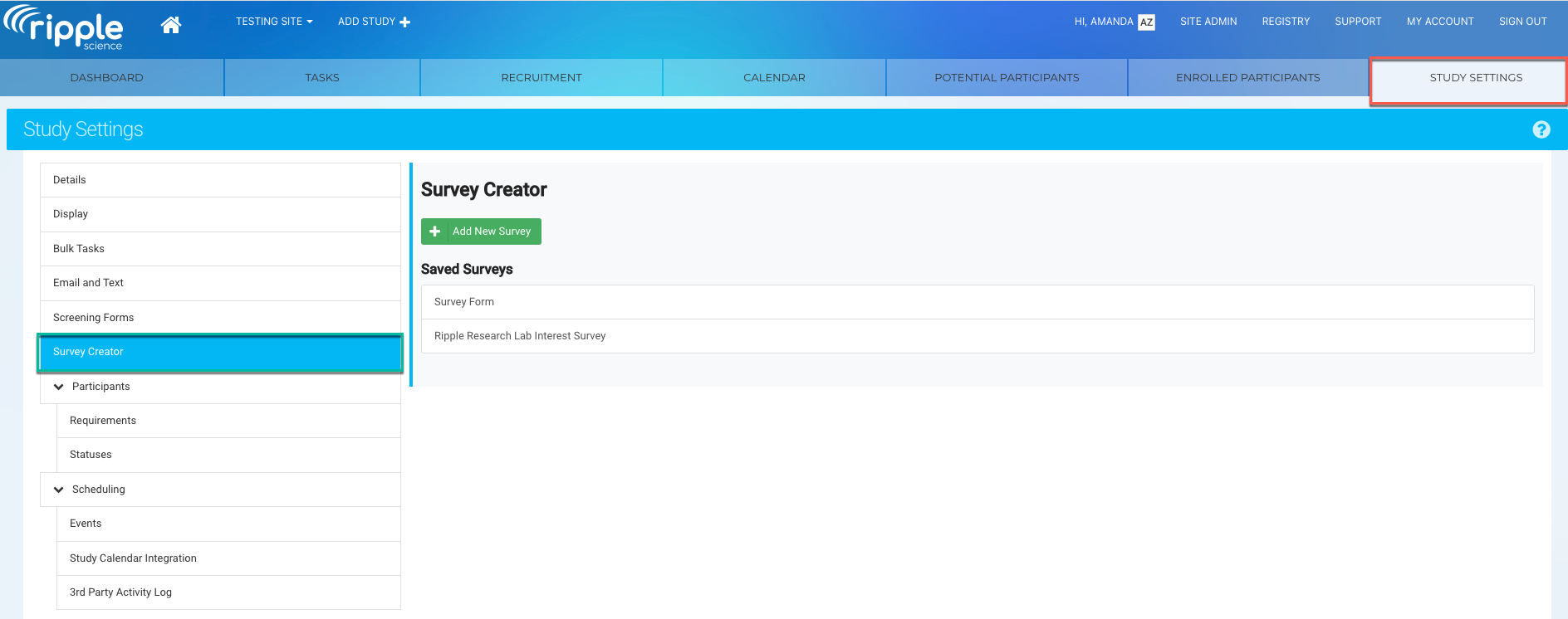 The Ripple Survey Creator enables users to design enhanced screening and survey forms with complex display logic and robust inclusion criteria. These surveys can be used for both internal participant screening and external data collection via web-based forms.