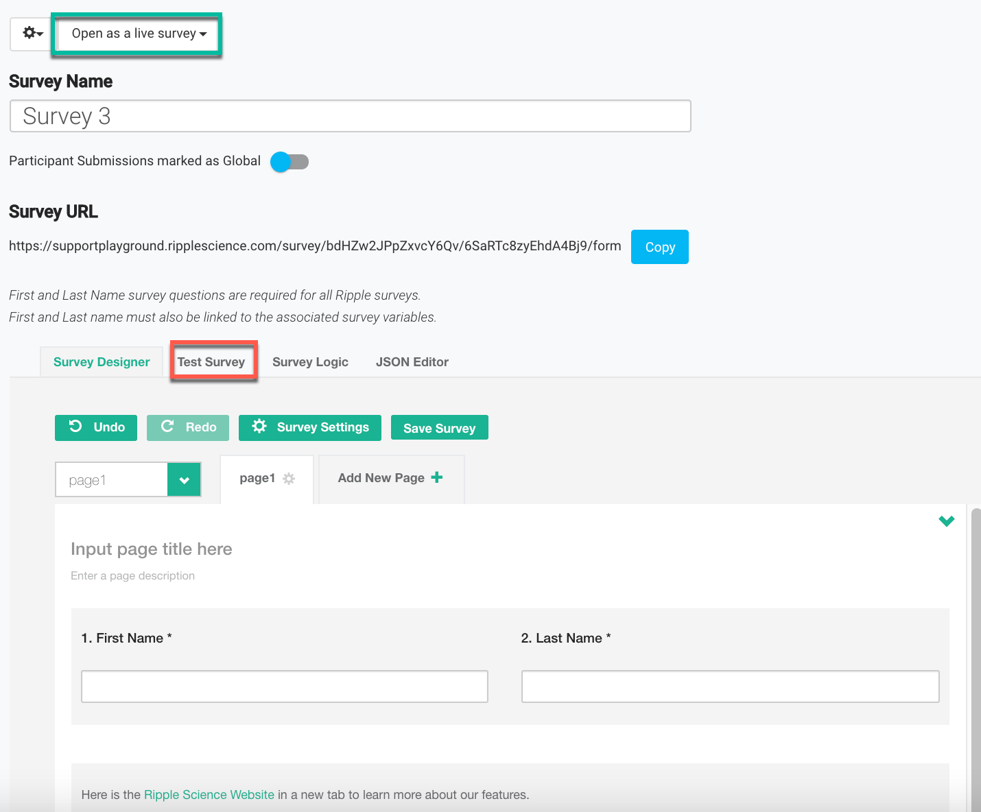 Click "Test Survey" (red) to preview how it works.