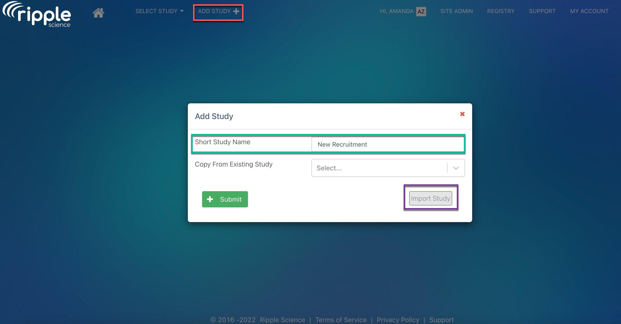 - Ensure you have Site Manager or Site Admin permissions for the Ripple instance where you want to import the study.