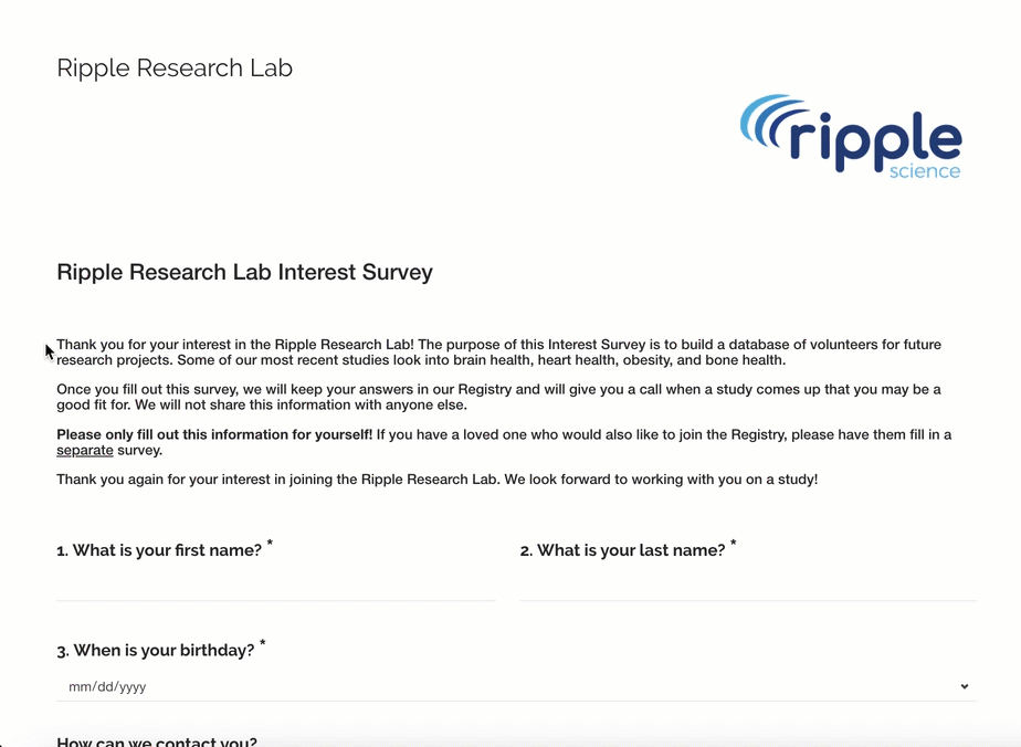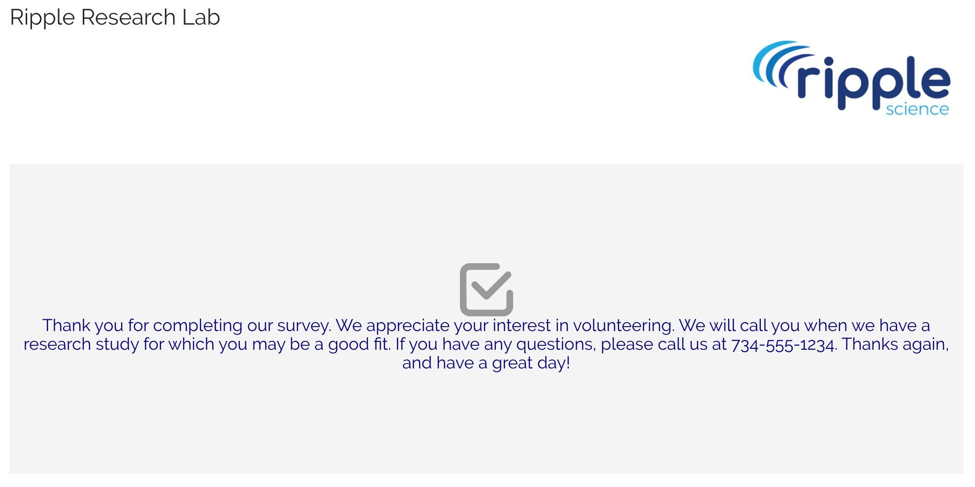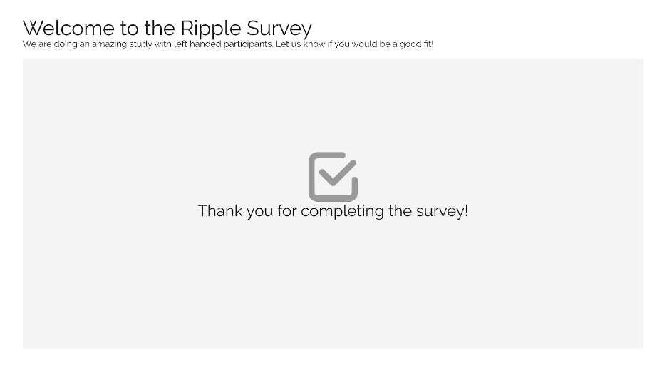 Instead of displaying a custom message, Ripple allows you to automatically redirect respondents to a specific webpage once they complete the survey. This feature is useful for directing participants to additional resources, study websites, or next steps.