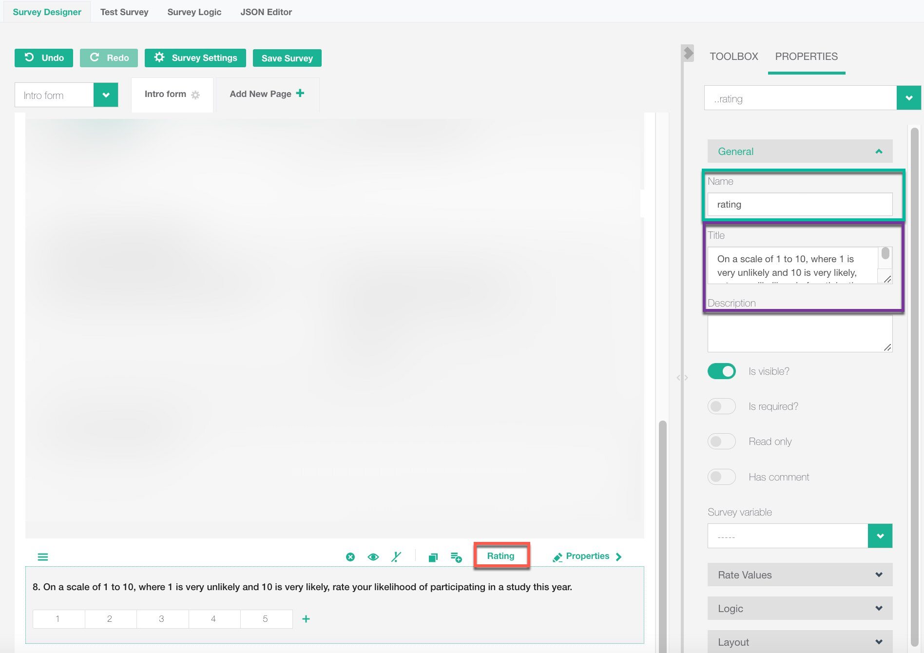 - Change the Name of the rating question to “rating” (green)