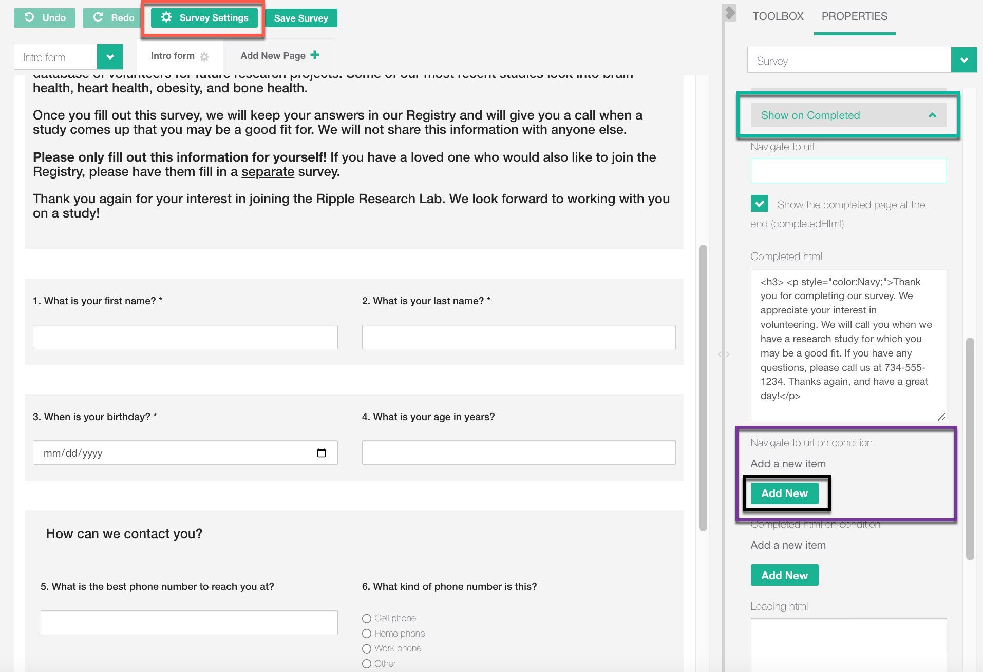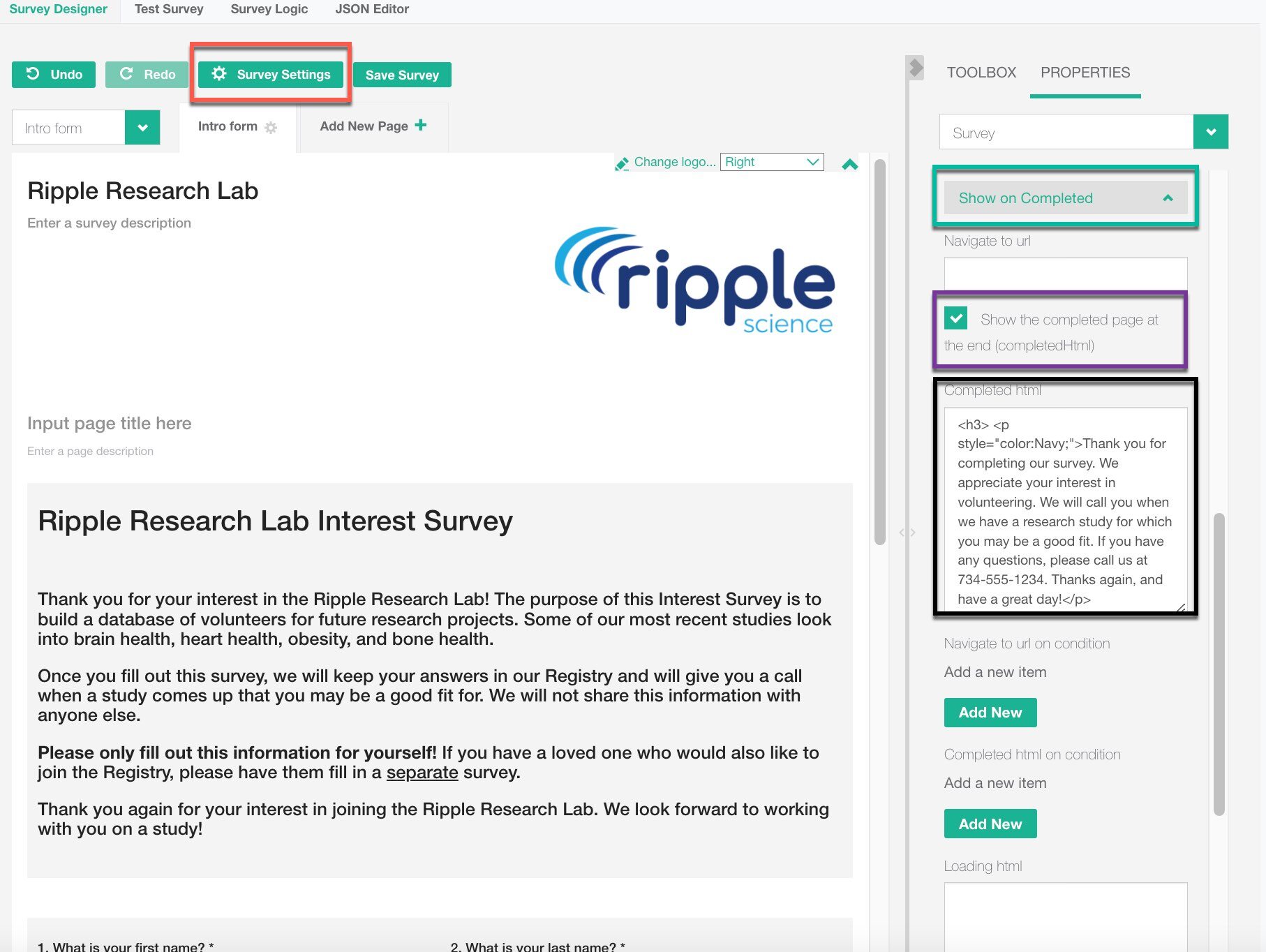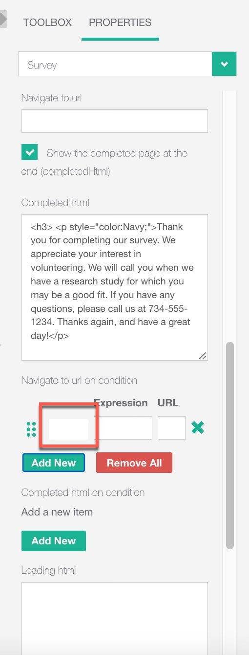 - In the "Completed HTML" textbox, type the message you want participants to see upon completing the survey.