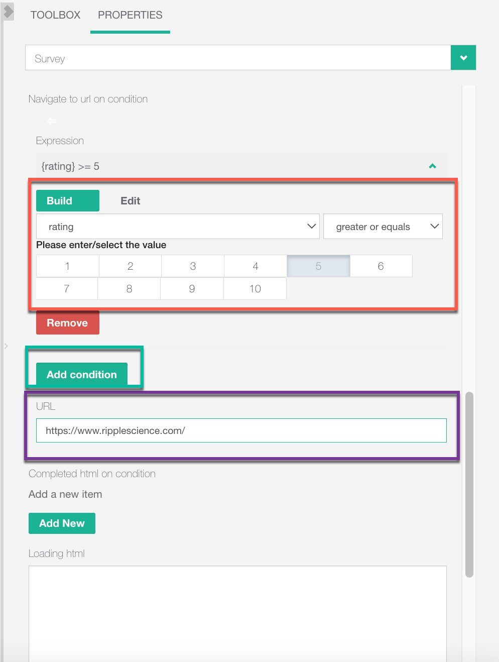- Enter the URL for participants to be redirected to when they select a rating above 5 (purple)