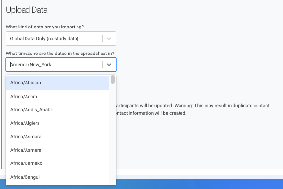 • Time zone choice may affect date and time variables and events for study-specific uploads.