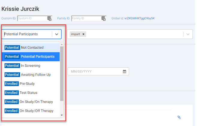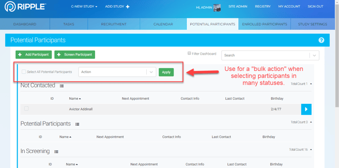 Ripple makes it easy to manage participants by allowing you to move them between user-defined statuses within the Potential and Enrolled participant tabs, as well as from the registry into a selected study.