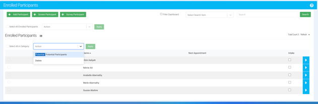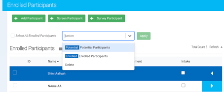 Participants can also be moved between Potential and Enrolled statuses using the same action dropdowns.
