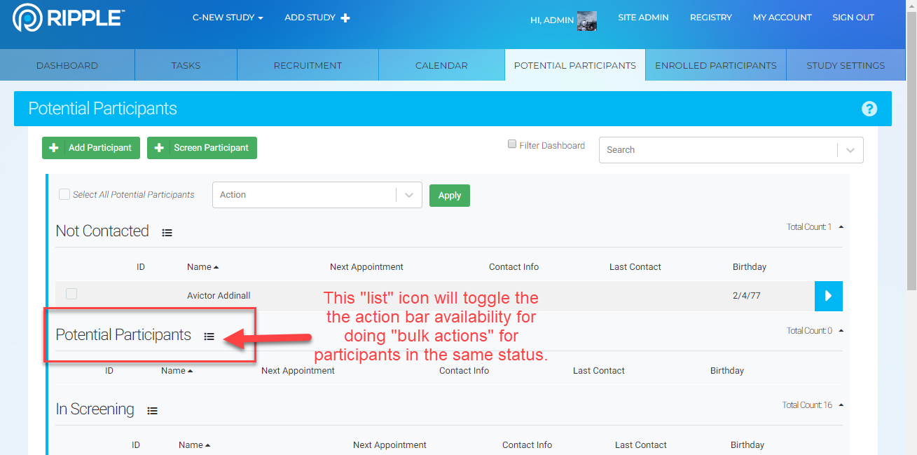 Click the list icon next to Enrolled or Potential Participants for that status section to reveal the localized action bar.