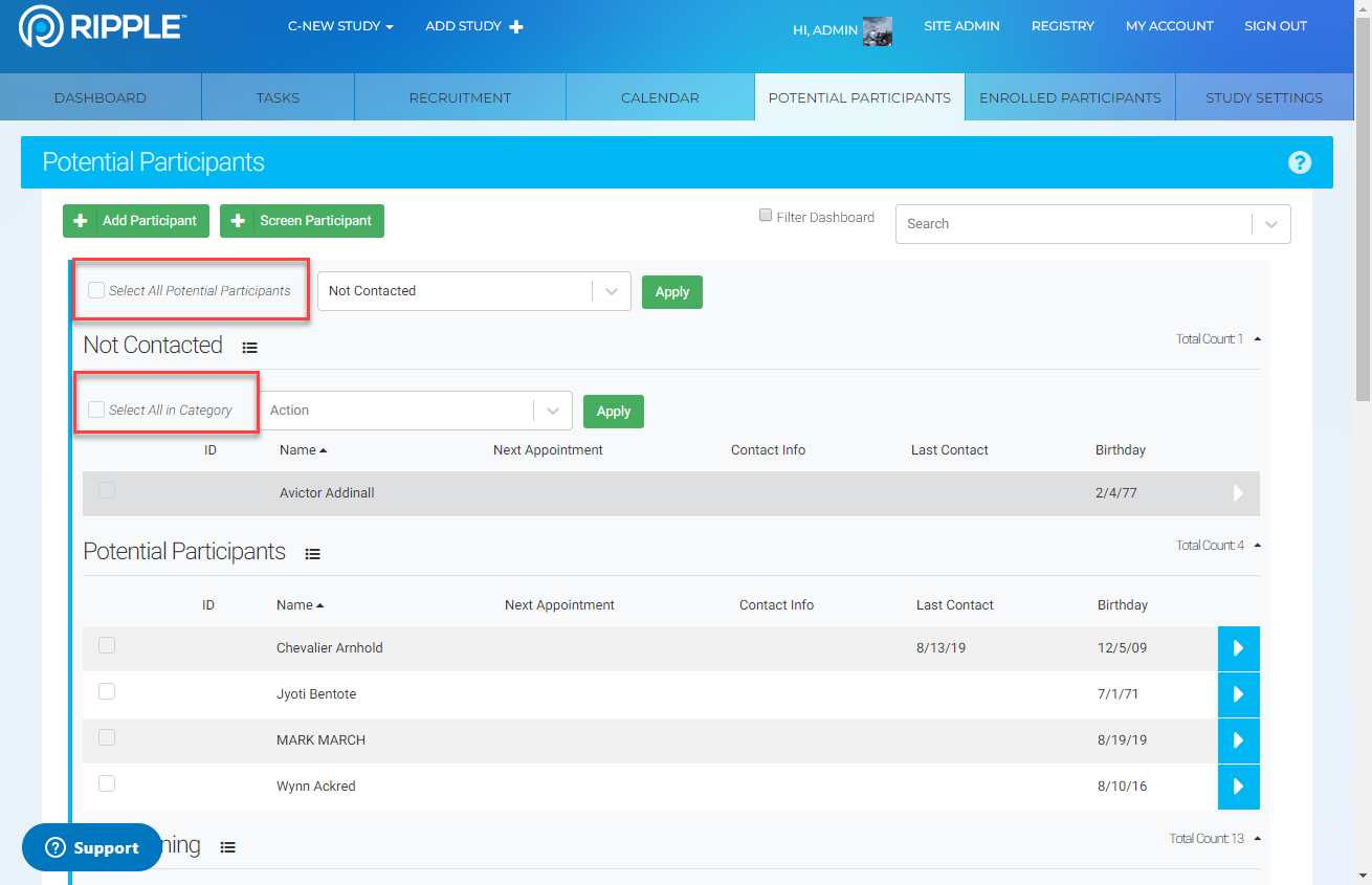 Select All Potential Participants – Selects all visible participants across all statuses in the Potential tab (limited to visible page only).
