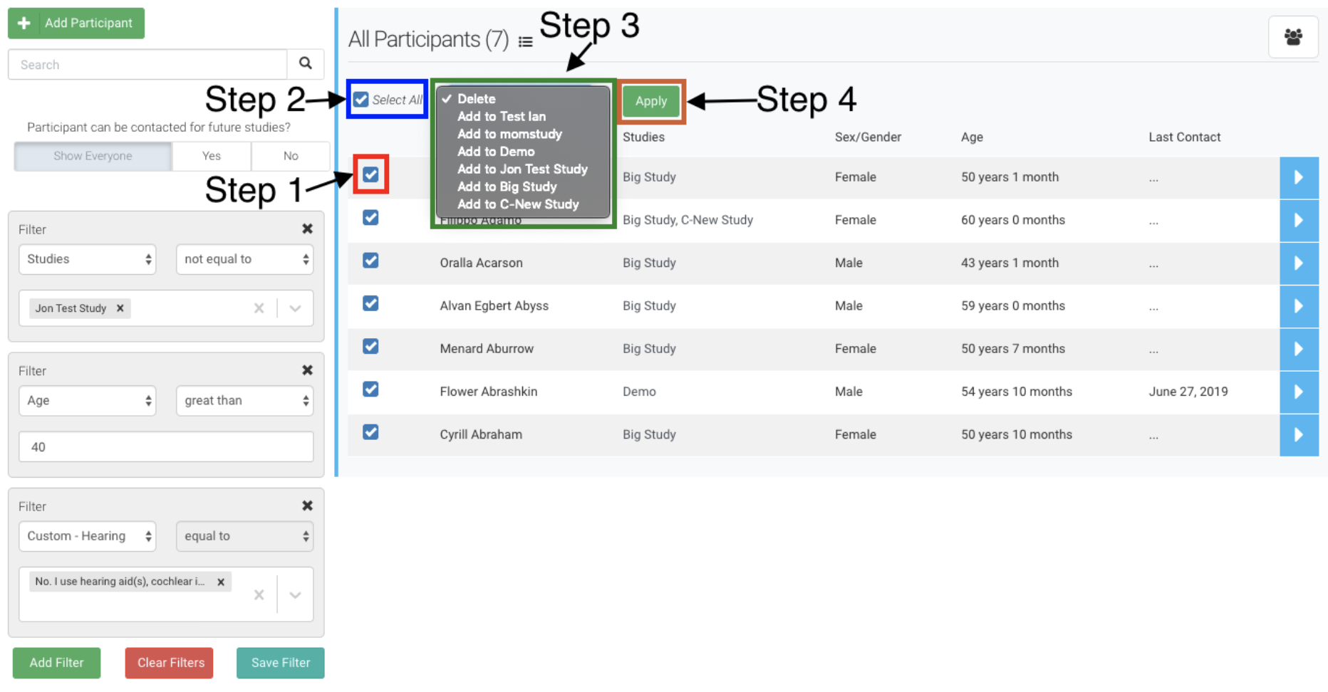 Once you have identified your target participants, you can add them to a study individually or in bulk for consideration or enrollment.