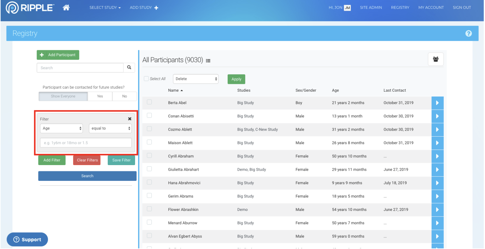Registry Filters allow you to segment your registry using predefined variables, including both Ripple preset variables and custom variables created by your lab for specific studies.