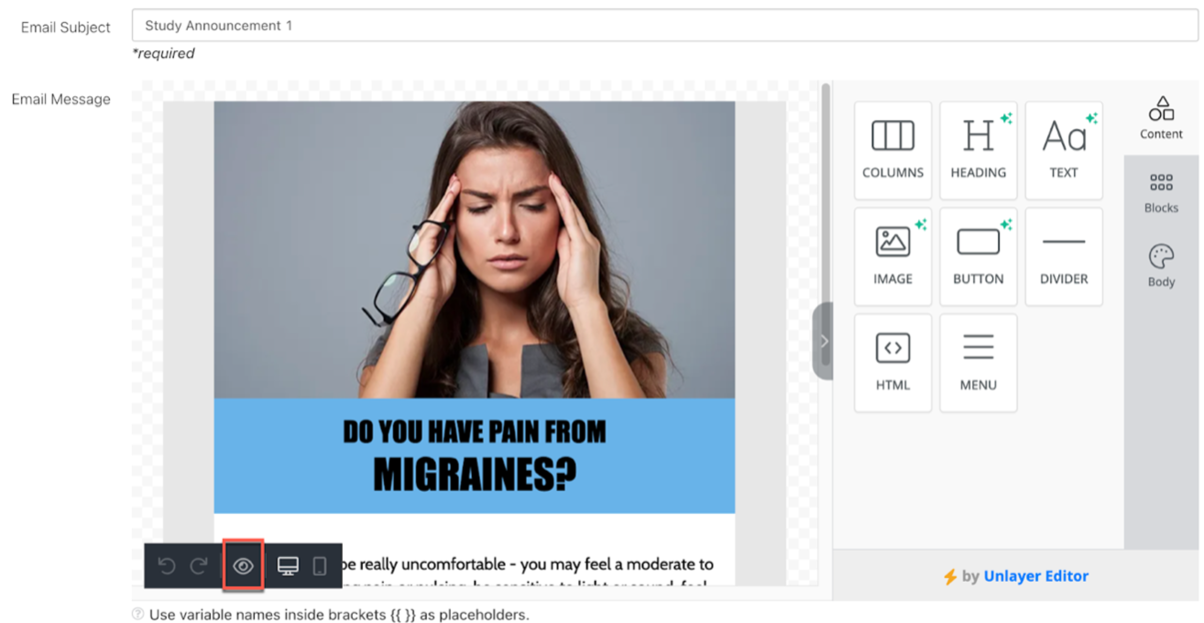 The preview will display the email dynamically, allowing you to verify that all merge tags and URL parameters (such as participant name, date, or study details) automatically populate with each participant’s information correctly.