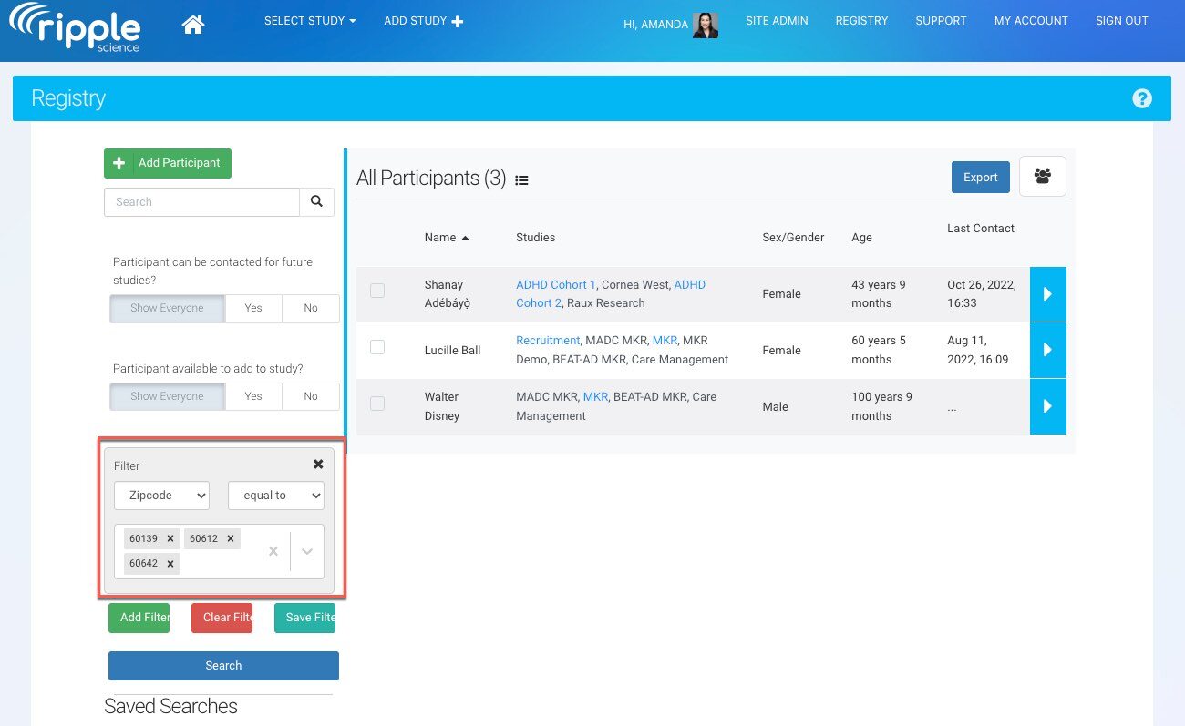 The Registry is a great tool for finding participants who meet specific criteria. Users can now filter the Registry by one or more zip codes. This can help teams identify participants who are closest to their research site to target them for study recruitment.