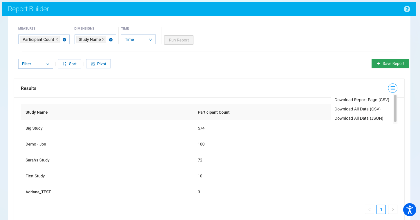 - Report Builder now has additional options for download, including an option that respects pivot table parameters. Options include: