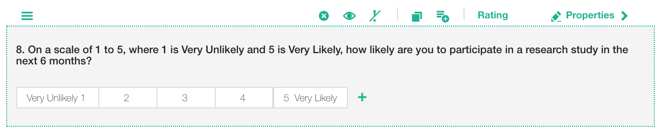 The Rating question type allows respondents to select one value from a range of numbers to provide feedback or a score.