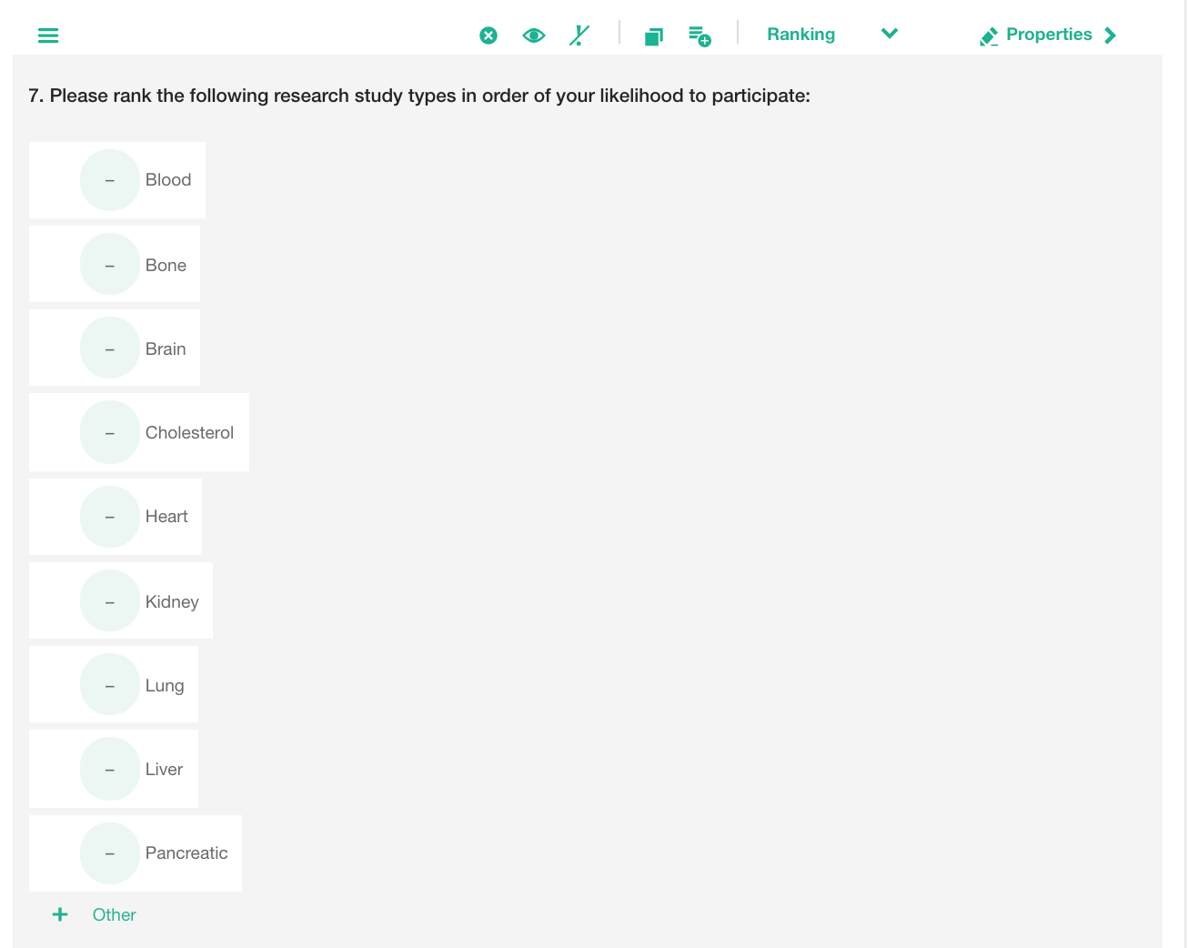 The Ranking question type allows respondents to prioritize a list of options by arranging them in order of importance or preference.