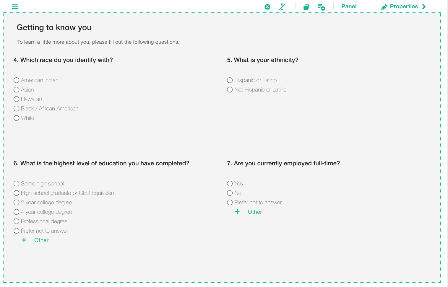✅ Works with participant variables – Each question within a panel can be linked to participant variables, depending on the question type.