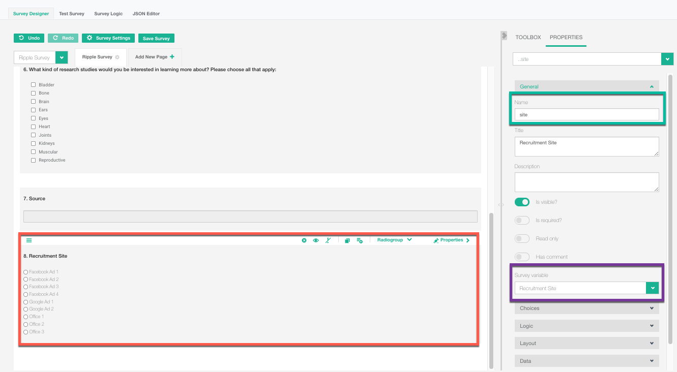 Ensure that the question’s Name matches the desired name in your URL. If you title the question "Site" but do not set its Name as "Site", the UTM parameter will not be captured correctly in your survey.