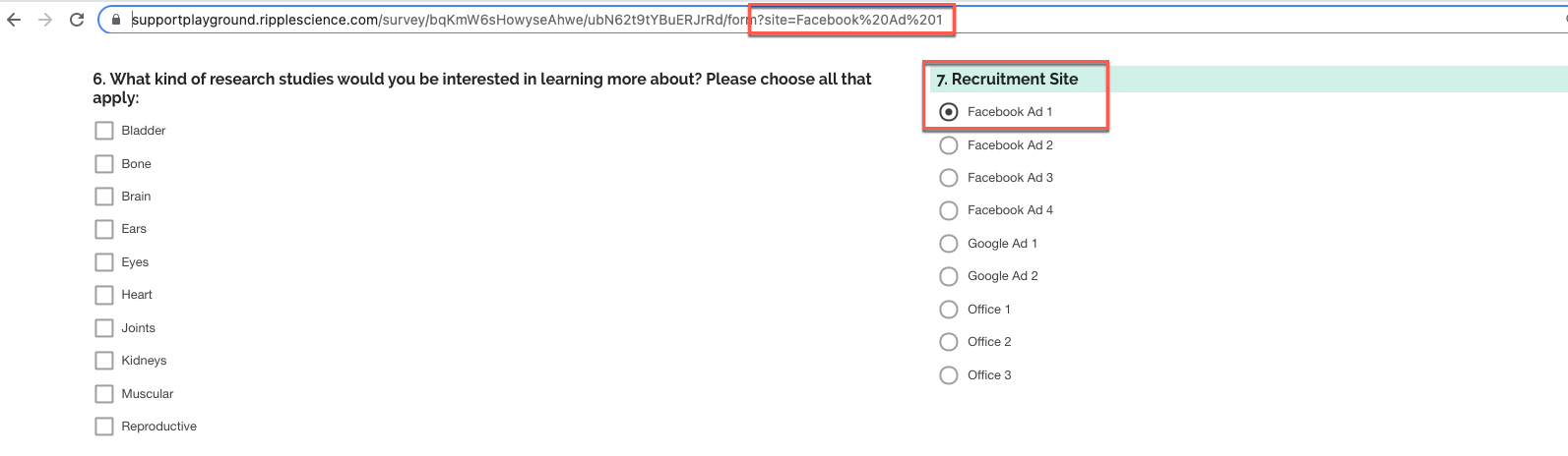 ?site=Facebook%20Ad%201tells Ripple that participants coming from this link should be tagged with the recruitment site Facebook Ad 1. -