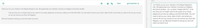 - Example: <p>Thank you for your interest in the Ripple Research Lab. We appreciate your interest in joining our Registry and future studies. </p><p style="margin-left:5%;">If at any time you no longer want to be a part of our study, please let us know by calling us at 555-555-5555. You will need to tell us your name, date of birth, and email you used to fill out your survey so we can remove you from the Registry.</p><p>We look forward to having you and will reach out soon!</p>