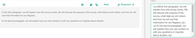 html<p>In this first paragraph, we will explain how this survey works. We will discuss the purpose of the survey, what data we will collect, and how we will use that information for our Registry.</p> <p>In the second paragraph, we will explain how you can contact us with any questions or inquiries about studies.</p>This structure improves readability and organization in your survey content.